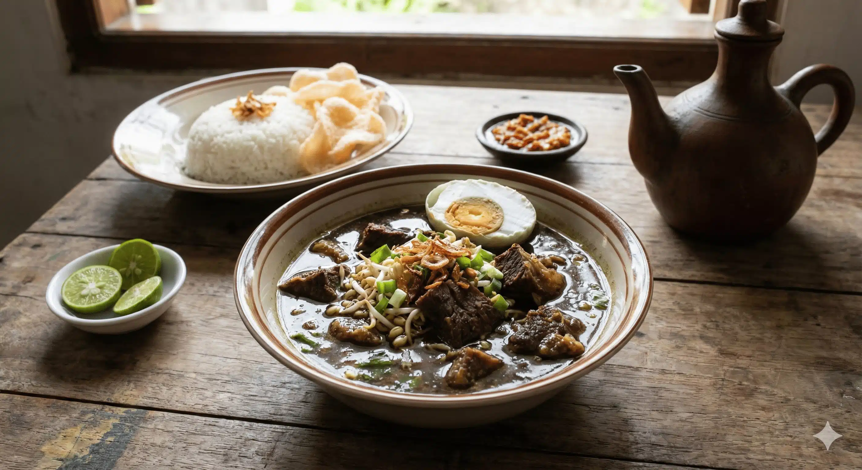 Hidangan soto berkuah kental yang gurih dan 'creamy', terbuat dari campuran santan dan susu sapi. Isian utamanya meliputi potongan daging sapi dan aneka jeroan (paru, babat, usus), disajikan dengan pelengkap emping melinjo, acar, sambal, dan perasan jeruk limau.